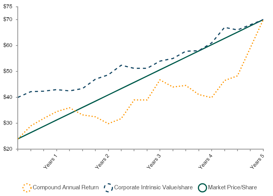 This illustration does not reflect performance of any particular security. Actual investment performance and returns are not guaranteed. “Margin of Safety” is a reference to the difference between a stock’s market price and Southeastern’s calculated appraisal value. It is not a guarantee of investment performance or returns. The P/V ratio represents a single data point and should not be construed as something more. P/V does not guarantee future results, and we caution investors not to give this calculation undue weight.